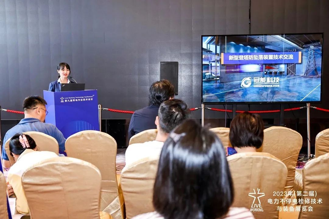 广东冠能电力科技发展有限公司技术人员李雨欣在“展区新产品技术沙龙”做“新型登塔防坠落装置”技术交流。